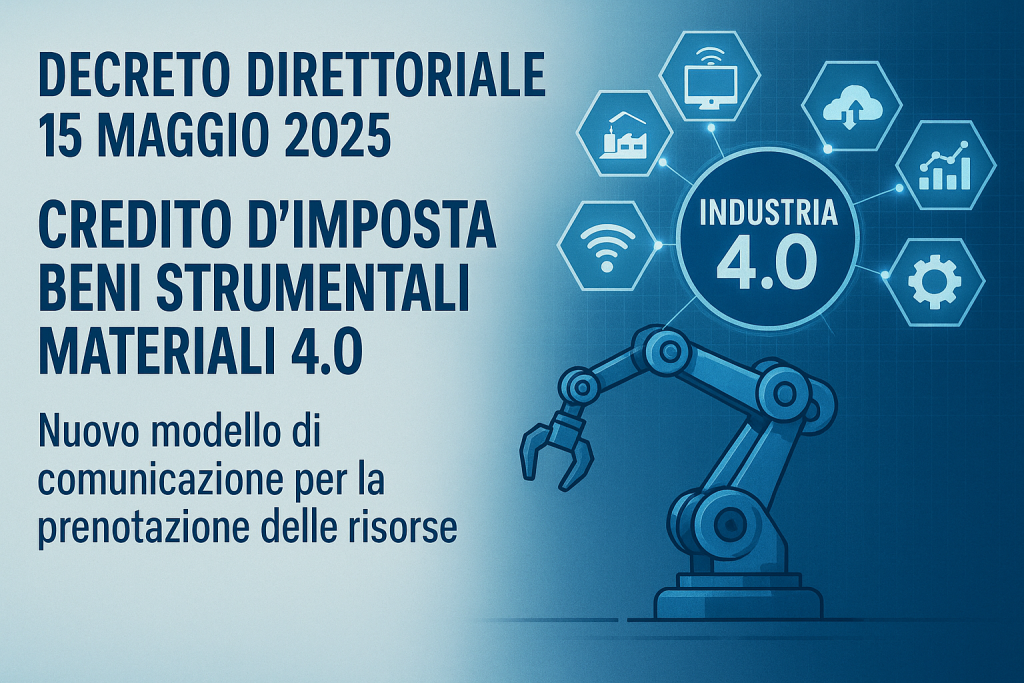 Ecco il link alla comunicazione ufficiale su MIMIT: https://www.mimit.gov.it/it/normativa/decreti-direttoriali/decreto-direttoriale-15-maggio-2025-credito-dimposta-beni-strumentali-materiali-4-0-nuovo-modello-di-comunicazione-per-la-prenotazione-delle-risorse Pubblicato il decreto direttoriale del 15 maggio 2025 È stato pubblicato